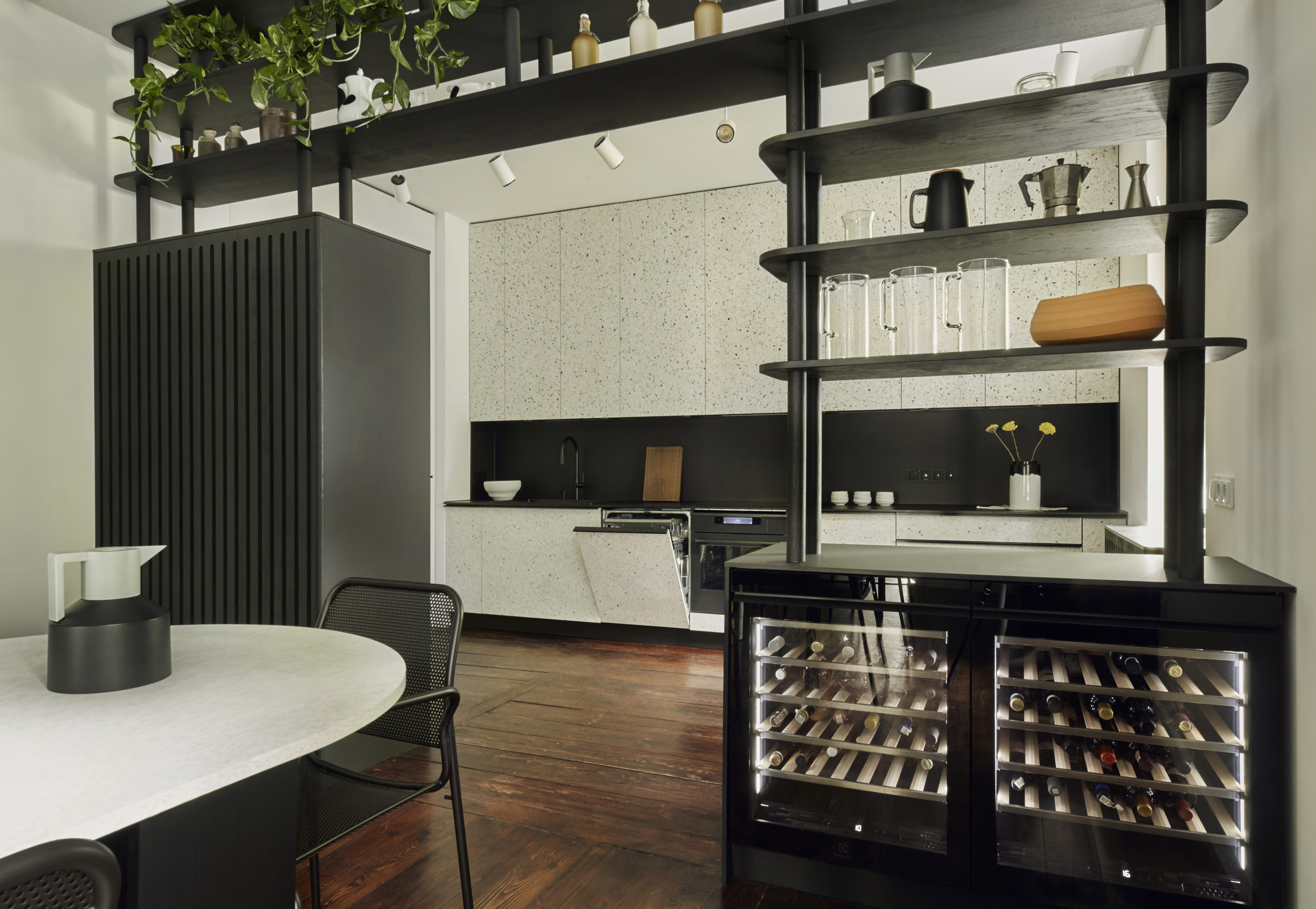 The choice of materials was key, prioritizing both durability and timelessness, along with ecological benefits. A standout feature of the interior is the materiality of the build-in cabinetry. Subtly resembling classic terrazzo, it’s fabricated from recycled consumer packaging - similarly as the top of the large communal table, which serves as the centre of the dining area. The functional and timeless wooden shelving that connects the kitchen to the dining area subtly yet unmistakably echoes the manor’s original antique furniture.